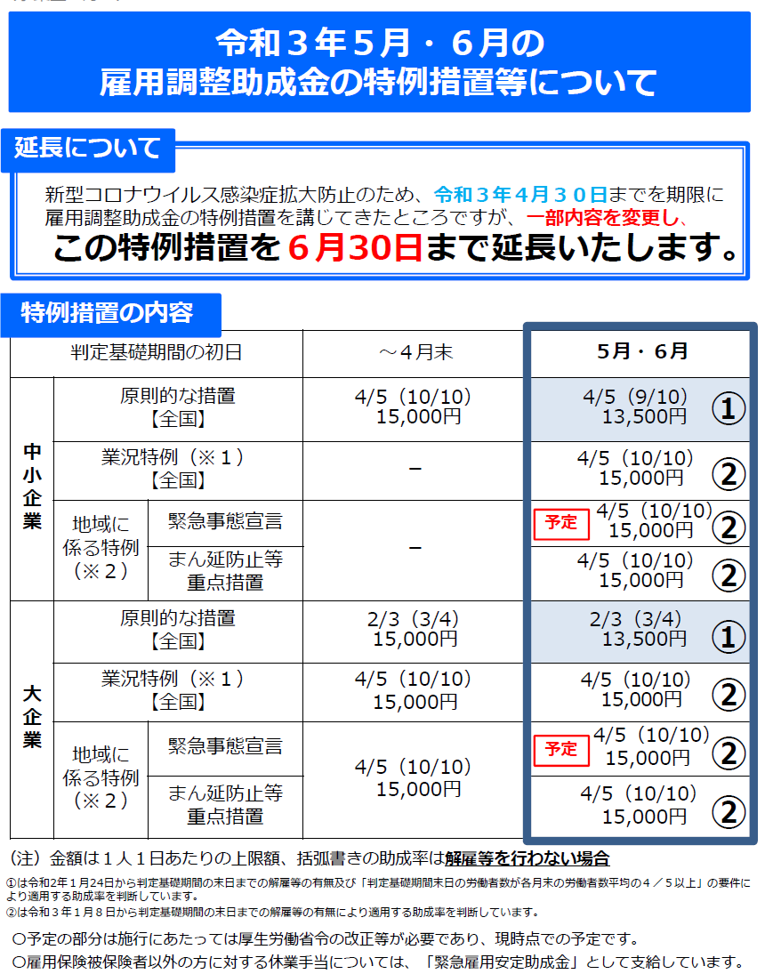 雇用調整助成金の特例扱いは4月30日期限でした。まん延防止措置対象地域についての特例扱いの延長が発表されていましたが、緊急事態宣言への対応措置について、本日4月30日、6月まで特例措置の延長として発表されましたのでお知らせいたします。