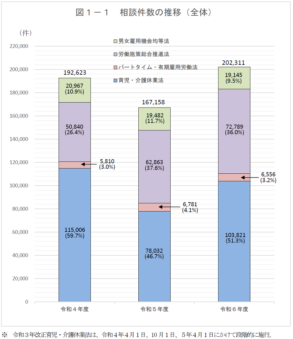 育児・介護休業法の相談件数は、103,821件(対前年度比 +33.0%)で、相談内容は、育児関係の相談が7割を占め、そのうち「育児休業」に関する相談が最多。 雇用管理の実態把握を行った 4,143 事業所のうち、育児・介護休業法違反が確認された 3,147事業所に対し、8,330件の是正指導を実施。 受理件数は 16件。 是正指導件数のトップ3は、育児休業では、①休業等に関するハラスメント措置 30.7%(第25条関係)、②雇用環境整備 23.3%(第22条第1項関係)、③育児休業 10.8%(第5条関係)、介護休業では、①休業等に関するハラスメントの防止措置 48.7%(第25条関係)、②介護休業 15.8%(第11条関係)。