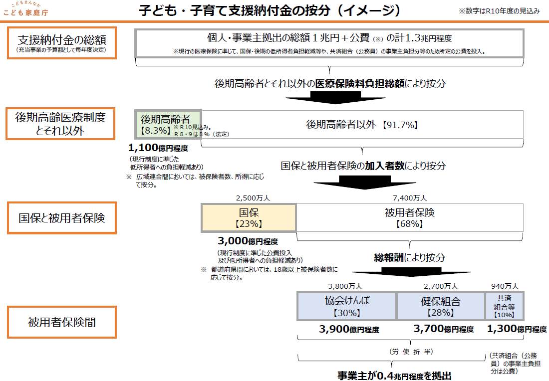 少子化対策の抜本的強化として、子育て世帯を支える新しい分かち合い・連帯の仕組みとして、 少子化対策に受益を有する全世代・全経済主体に、医療保険の保険料とあわせて、令和8年度から拠出が始まる新制度となります。