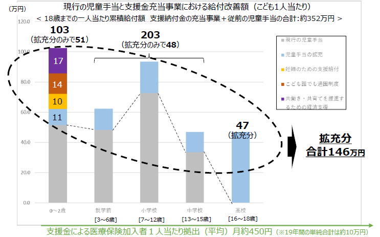 この制度により、現行の児童手当給付平均額206万円に、下図の通り、高校生までの子供一人当たり146万円の給付改善が見込まれる(合計で352万円)とのことです。